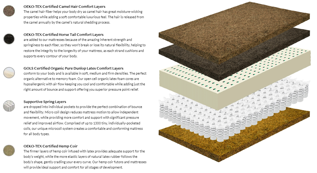 The Royal Night Medium Firm Mattress is wonderfully luxurious featuring all-natural and organic materials to provide you with the cleanest and eco-friendliest sleep of your dreams. Made with Oeko-Tex 100 certified Horsetail and Camel hair, organic botanical latex, recycled steel micro-coils, and an Oeko-tex 100certified hemp coir base layer, all wrapped in a GOTS-certified organic cotton and natural wool case.