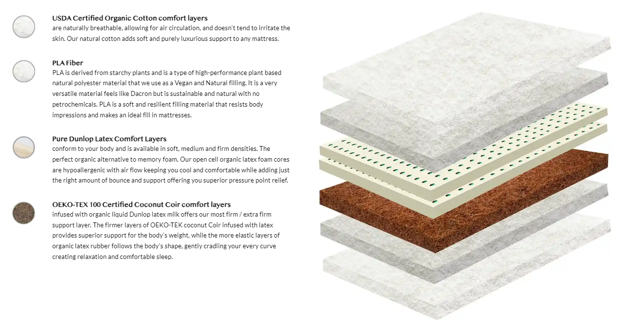 GOLS Certified Organic and Botanical Dunlop Latex, crafted from the Hevea Brasiliensis, or Rubber Tree, this latex is sourced using the natural steam method of curing through the Dunlop process, ensuring purity and eco-friendliness. Embrace a naturally antimicrobial and dust mite-resistant sleep environment, while experiencing unparalleled pressure relief. Rest assured, our latex is 100% chemical-free, embodying a commitment to your health and well-being. Indulge in a restful slumber knowing you're making an eco-conscious choice with our sustainable, GOLS-certified latex mattress.